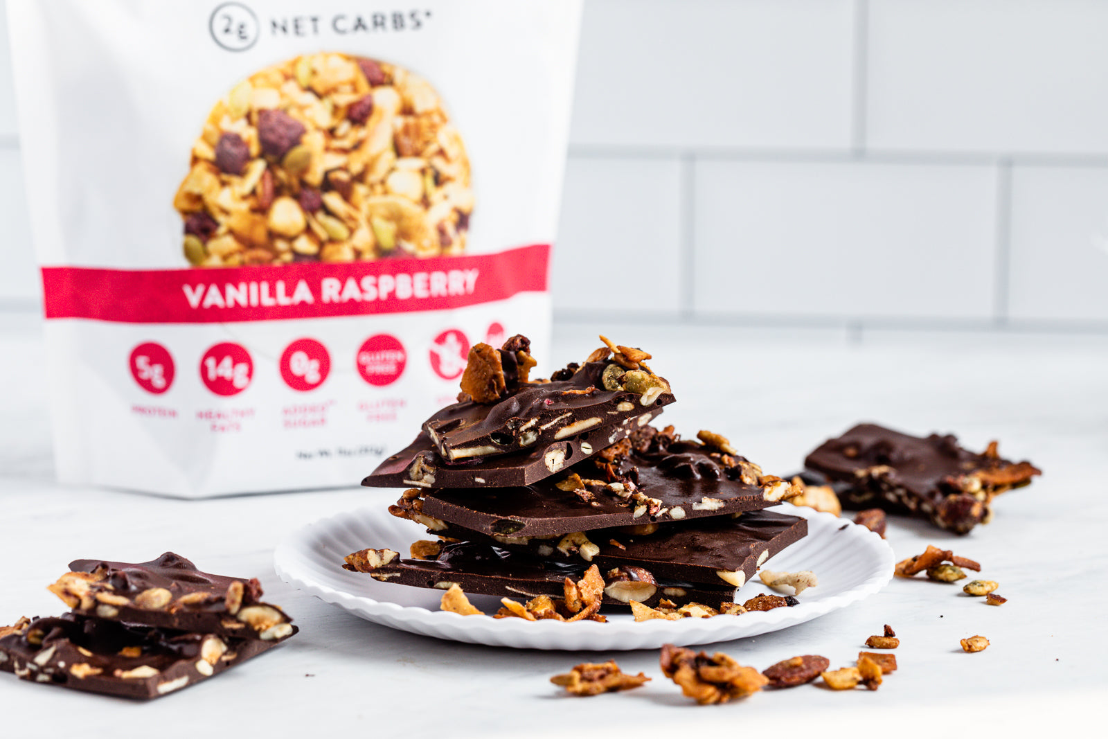 And best of all, this chocolate bark is totally keto-friendly! It gets crunch and sweetness from our Vanilla Raspberry Nut Granola.