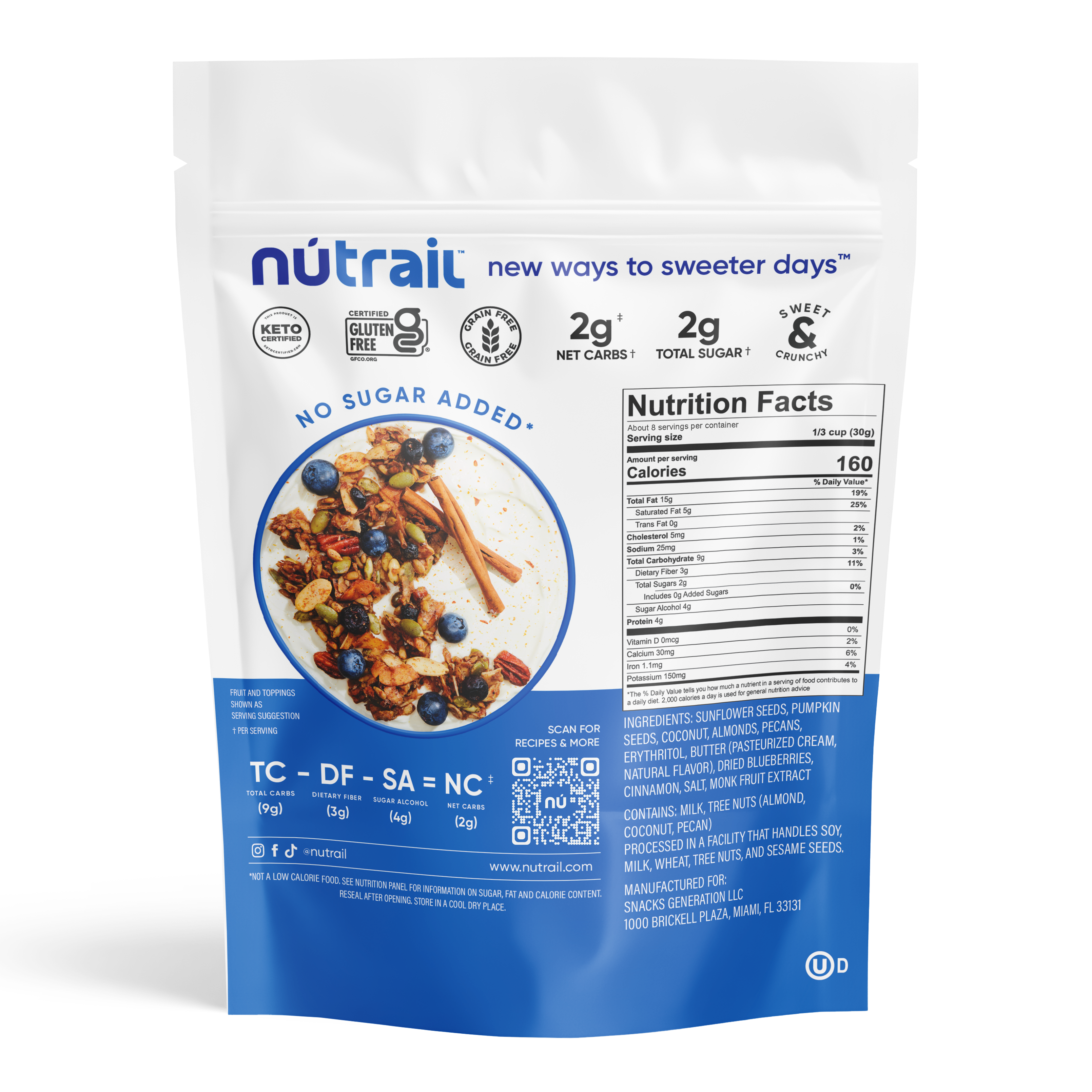 Ingredients: Sunflower Seeds, Pumpkin Seeds, Coconut, Almonds, Pecans, Erythritol, Butter (Pasteurized Cream, Natural Flavor), Dried Blueberries, Cinnamon, Salt, Monk Fruit Extract.
