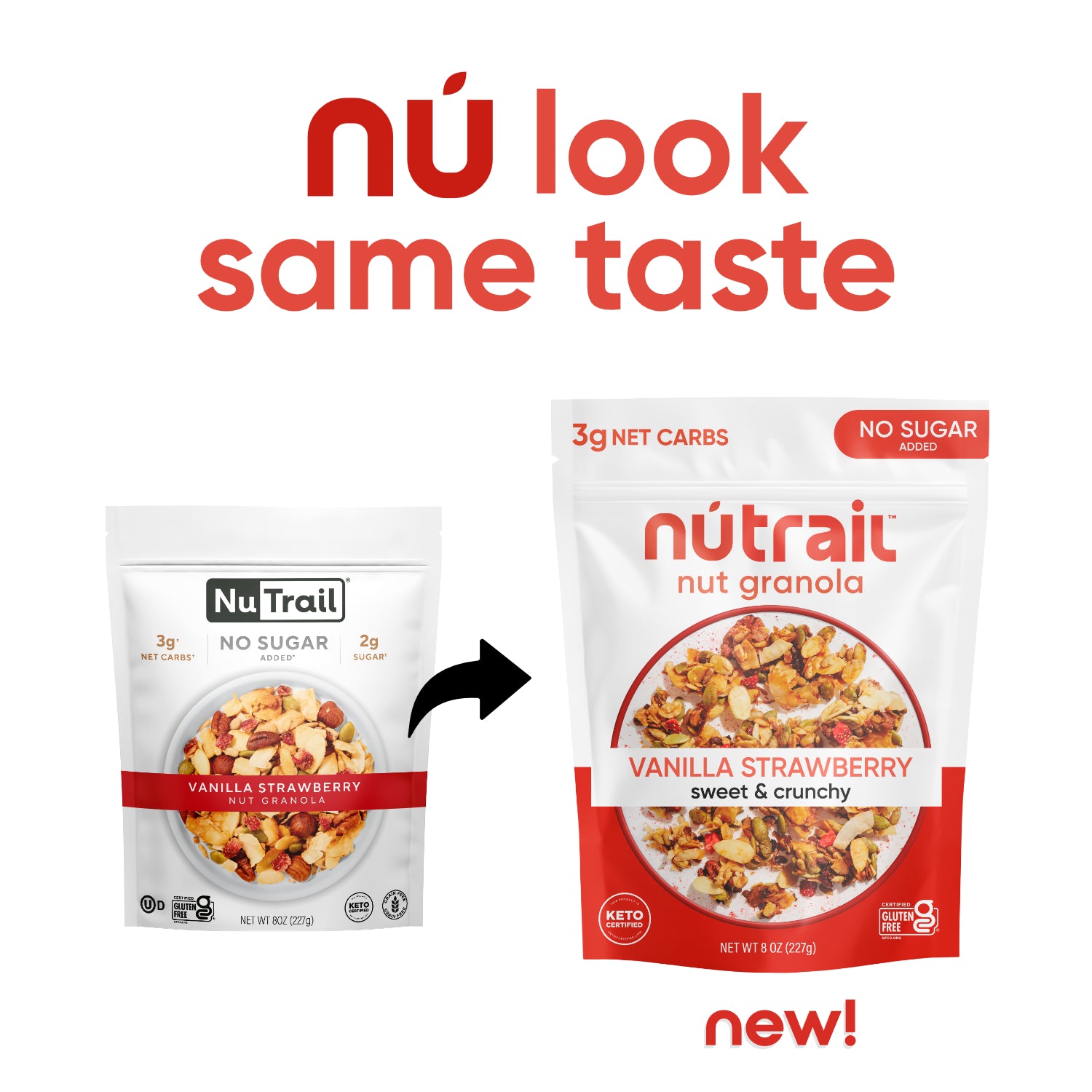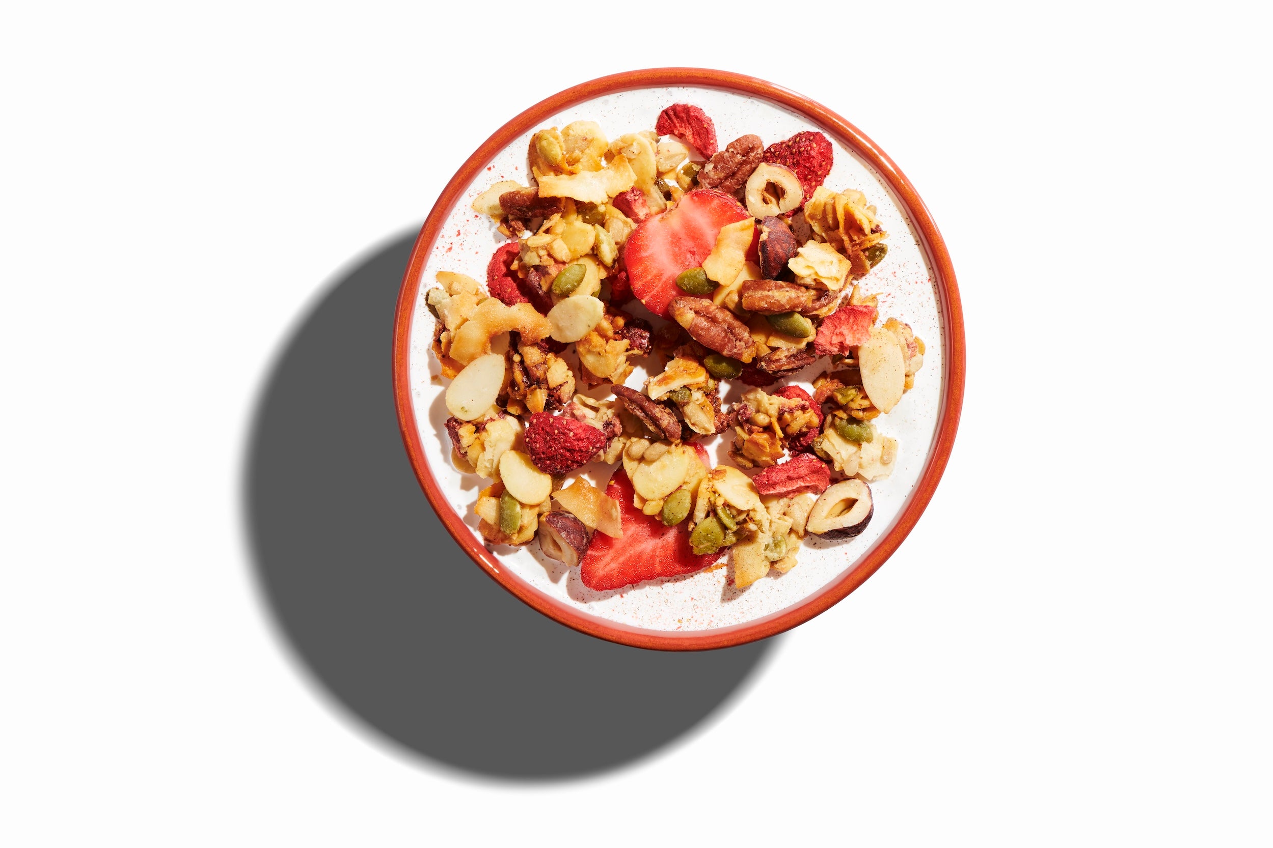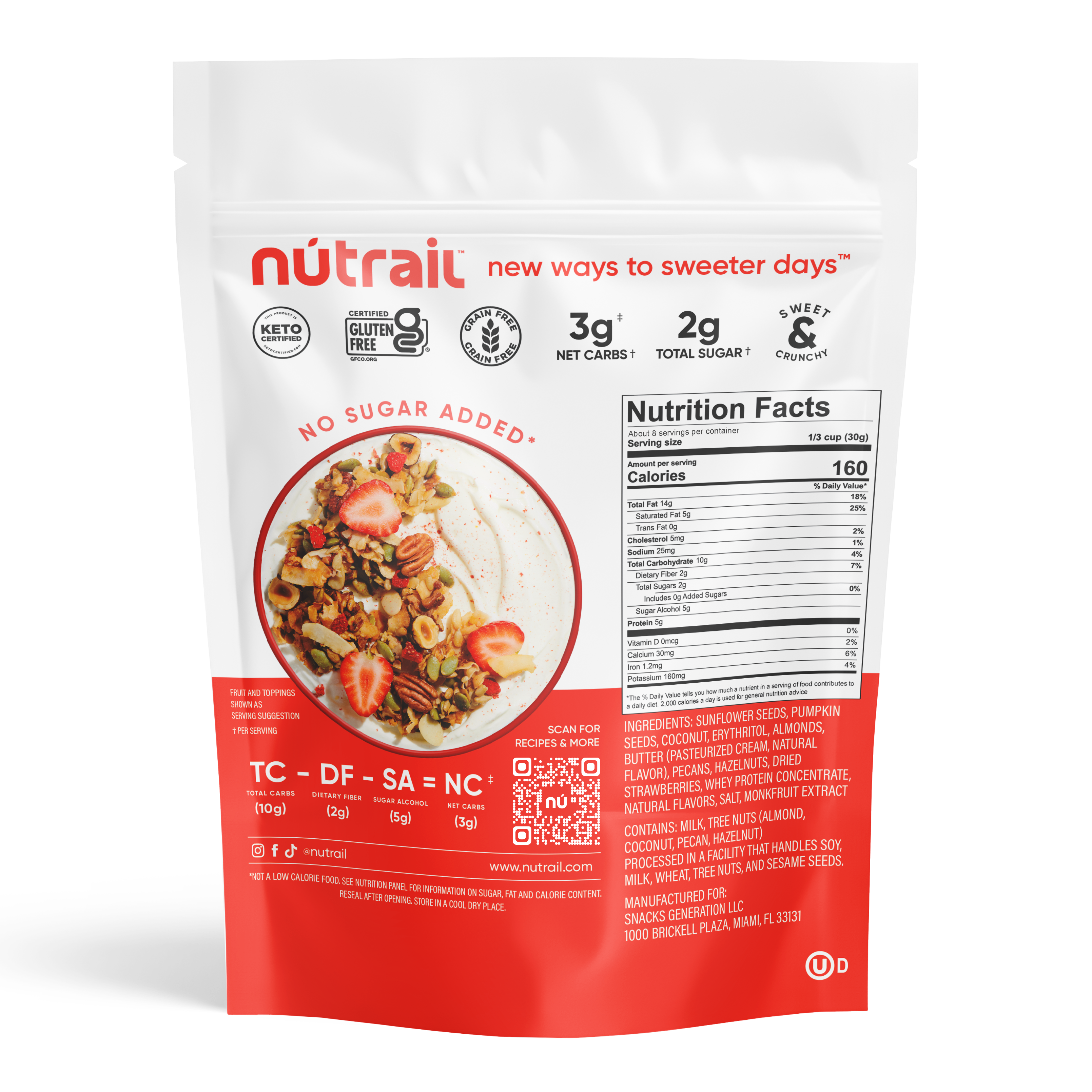 Ingredients: Sunflower Seeds, Pumpkin Seeds, Coconut, Erythritol, Almonds, Butter (Pasteurized Cream, Natural Flavor), Pecans, Hazelnuts, Dried Strawberries, Whey Protein Concentrate, Natural Flavors, Salt, Monkfruit Extract.